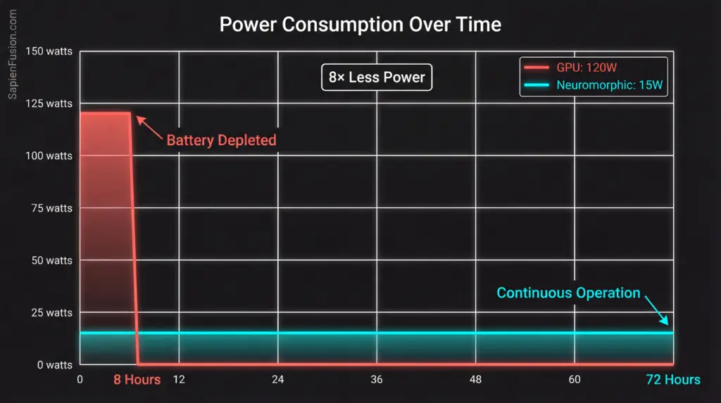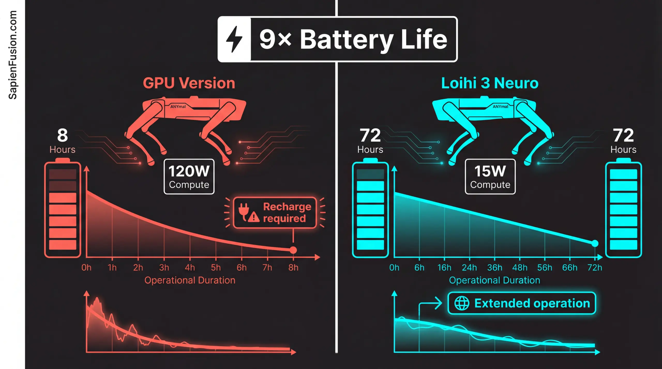 The performance metrics reveal the magnitude of improvement. The GPU-powered ANYmal D consumed approximately 120 watts for compute during active operation, requiring 960 watt-hours for eight-hour missions. The Loihi 3-powered ANYmal D Neuro consumed approximately 15 watts for equivalent compute, requiring just 1,080 watt-hours for 72-hour missions—the same battery capacity delivering nine times longer operation.