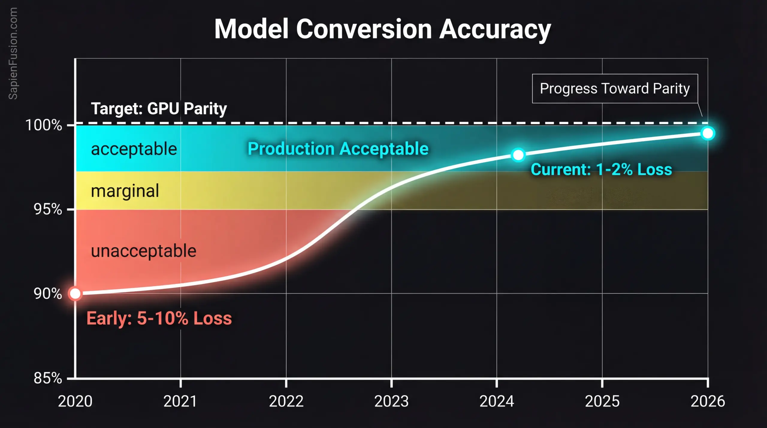 Early conversions suffered accuracy degradation, reaching 5-10% compared to original models—unacceptable for most applications. Recent algorithmic advances and improved tools reduced degradation to 1-2%, but achieving this requires significant expertise and iterative refinement. The process remains more art than engineering.