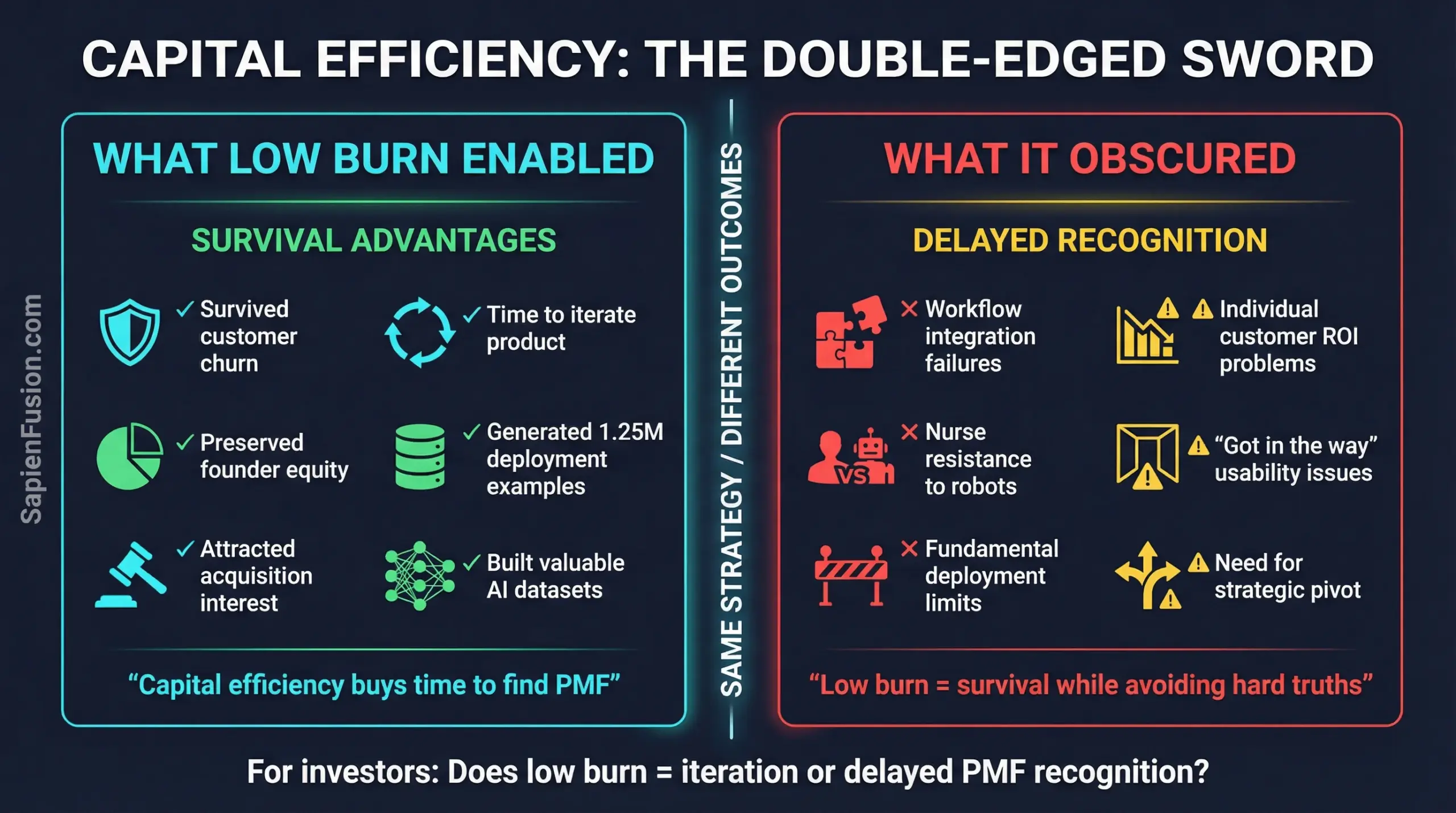 The question for operators: Does your capital efficiency buy time to iterate toward genuine product-market fit, or does it enable survival while avoiding hard truths about customer value?
