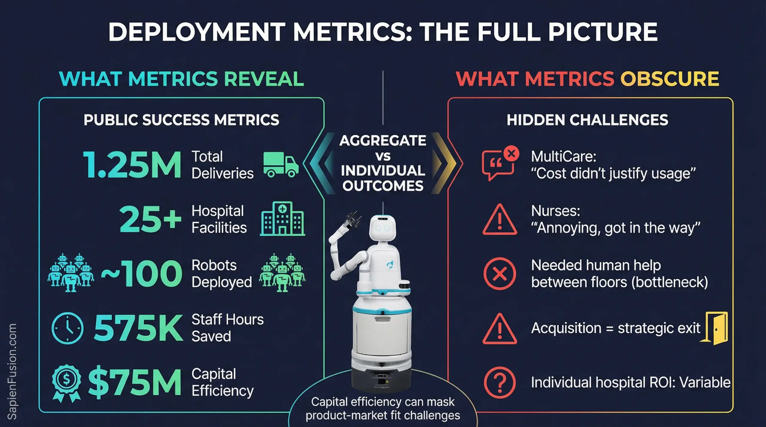 1. Deployment count ≠ customer retention 1.25 million deliveries across 25+ hospitals sounds impressive until you learn MultiCare (14 robots) terminated citing cost/value mismatch. Aggregate metrics can mask individual customer failures.